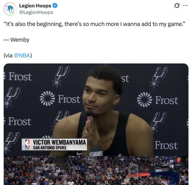 谈到个人表现时,文班亚马坦言自己今夏真得非常努力,本场比赛只是个开始,自己还有很多东西会继续加入到比赛中,这需要一些时间,顺其自然就好。