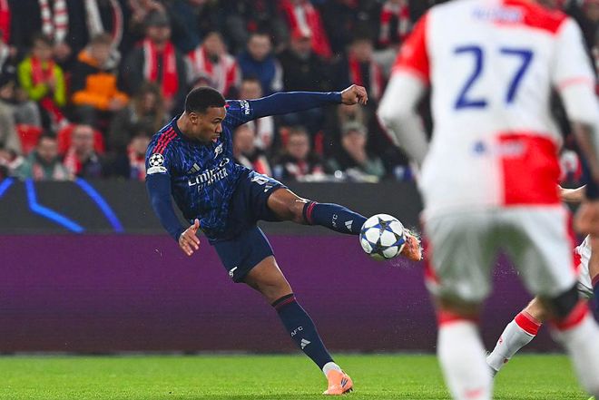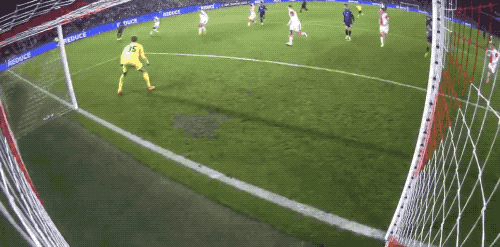 第35分钟,戴上队长袖标的萨卡操刀主罚,球速快角度刁,门将判断正确也无济于事,枪手取得领先,这也是萨卡本赛季欧冠的第2个进球。