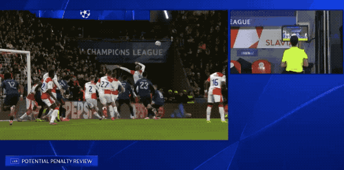 阿森纳攻势如潮,布拉格斯拉维亚越来越被动,第30分钟,阿森纳的第5个角球终于等到了机会,加布里埃尔头球攻门,皮球打在防守球员的手臂上。