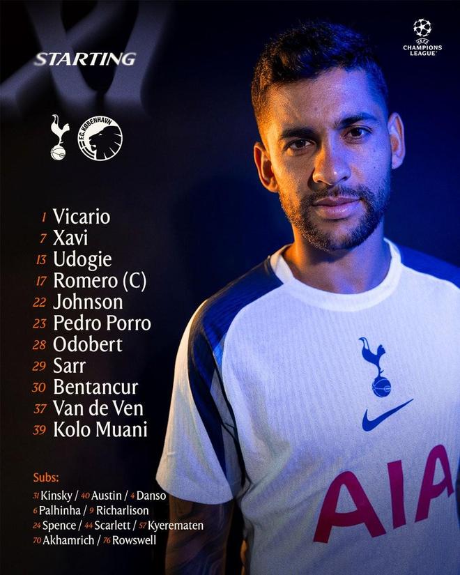 托特纳姆热刺首发:1-维卡里奥、7-哈维-西蒙斯、13-乌多基、17-克里斯蒂安-罗梅罗、22-布伦南-约翰逊、23-波罗、28-奥多贝尔、29-帕普-萨尔、30-本坦库尔、37-范德芬、39-穆阿尼